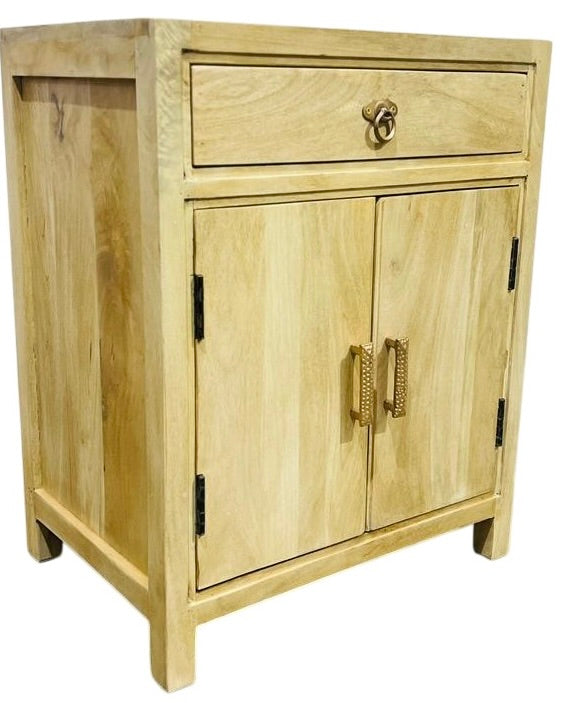 Elevate your bedroom with this refined bedside table, thoughtfully crafted with traditional Indian craftsmanship. Featuring a single drawer and two doors, it offers generous storage for essentials while maintaining a clean, elegant silhouette. The warm wood tones and intricate detailing bring timeless character to any sleeping space, blending functionality with understated luxury for a sophisticated sanctuary.