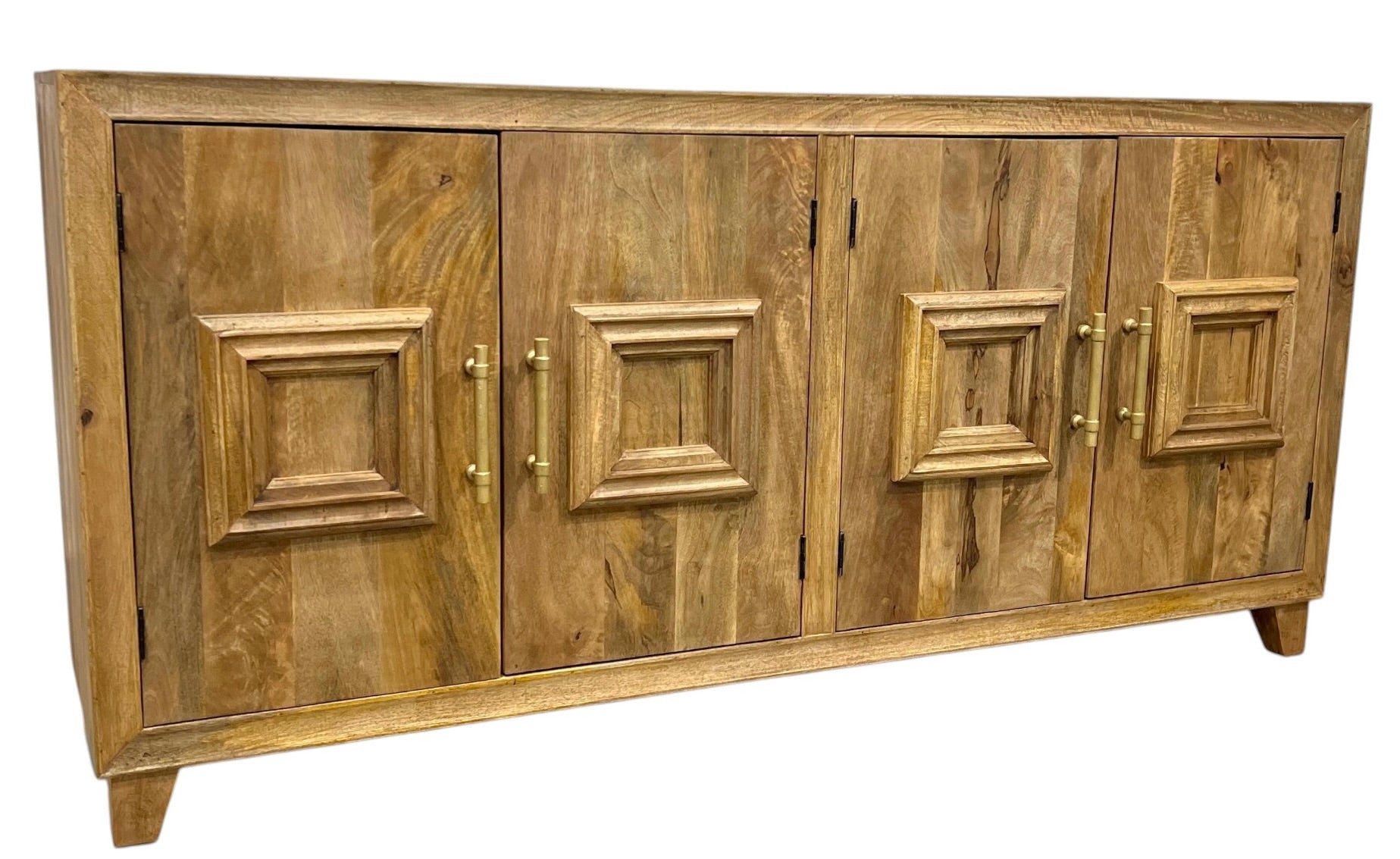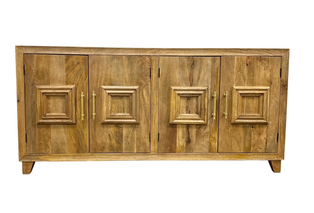 This elegant 4-door sideboard crafted from natural timber combines lasting durability with refined simplicity. Its smooth brass handles add a touch of sophistication, making it an ideal centerpiece for organizing and elevating your living or dining space. With ample storage behind each door, it helps keep your home tidy while showcasing timeless design.