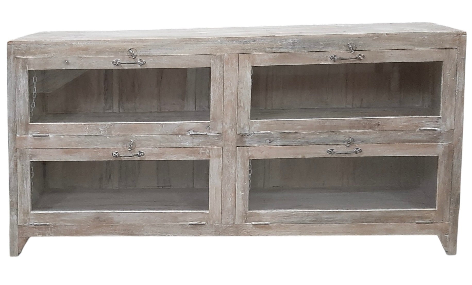Elevate your living space with this sophisticated 4-door glass sideboard crafted from rich teak wood. Originating from India, its sleek glass panels beautifully showcase your curated collections while the durable teak frame ensures lasting elegance. Perfect for combining style and functionality, this sideboard adds a refined touch to any room.