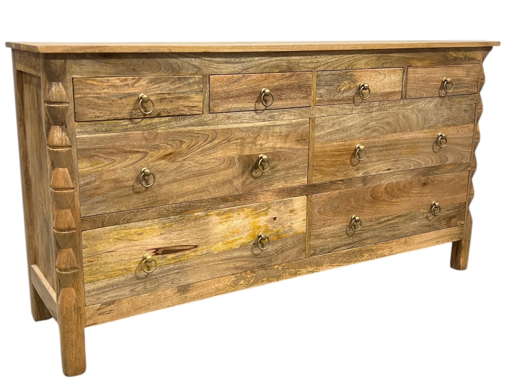 Crafted from premium mango wood sourced in India, this sideboard with drawers combines timeless elegance and durable quality. Its rich grain and sturdy construction offer both aesthetic appeal and practical storage, making it an ideal addition to sophisticated living or dining spaces. Experience the blend of natural beauty and functionality with this expertly crafted timber piece.
