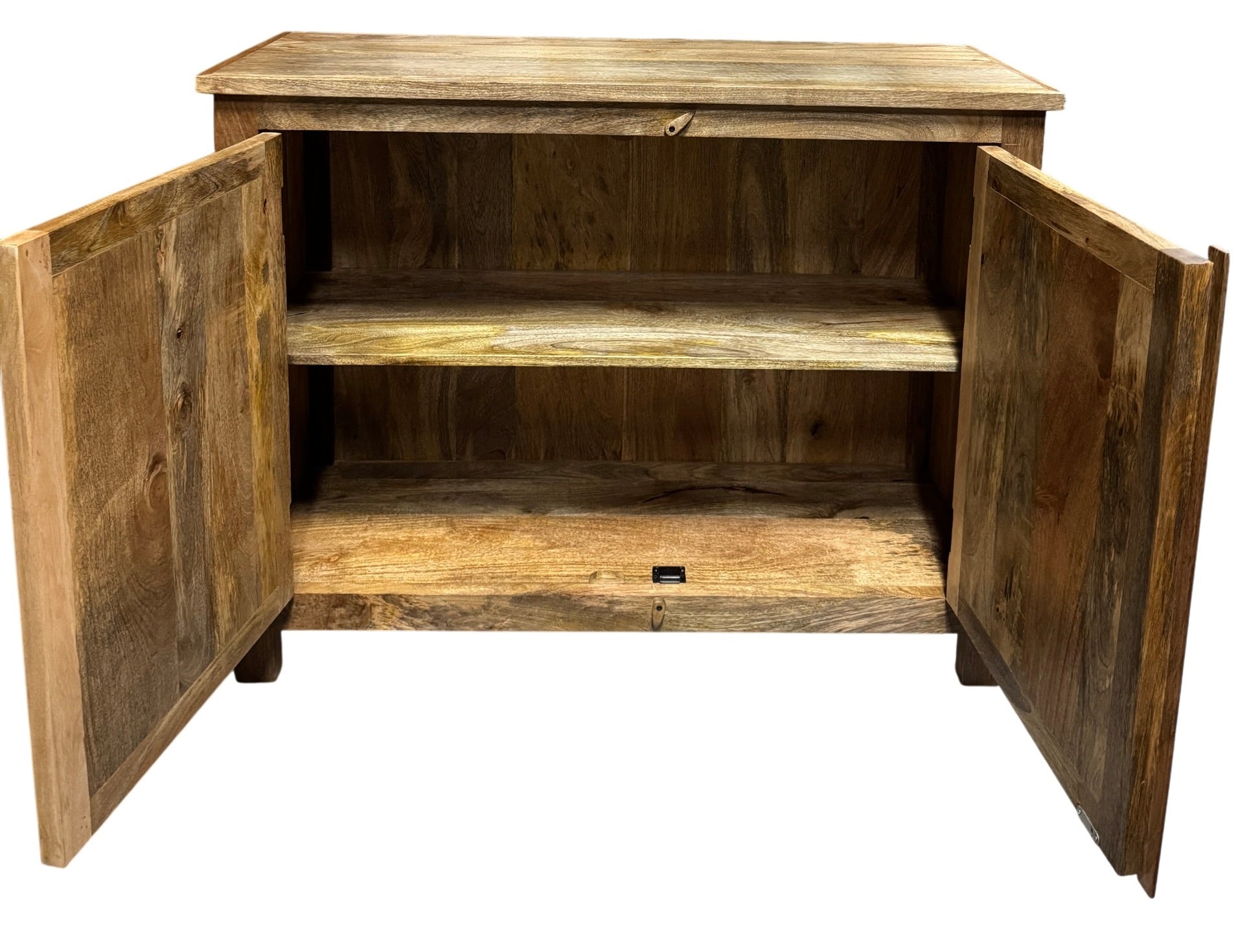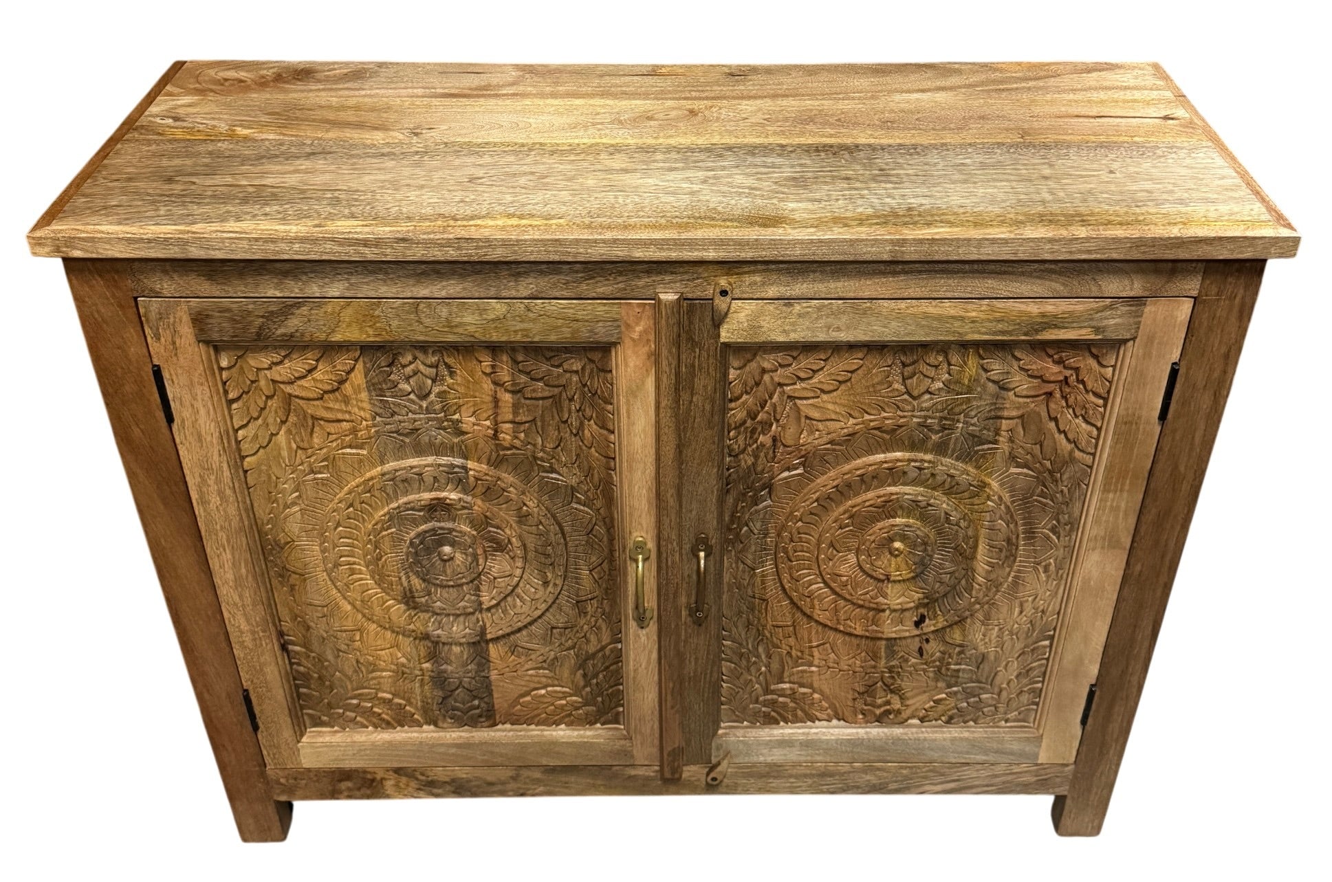 Crafted from authentic Indian mango wood, this elegant 2-door cabinet showcases intricate hand-carved detailing that speaks to traditional artisanal craftsmanship. The versatile design functions beautifully as a vanity or storage cabinet, bringing warmth and character to any room. Each piece is unique, with natural wood variations and carved embellishments that add timeless sophistication to your interior. Perfect for those who appreciate handmade quality and distinctive design.