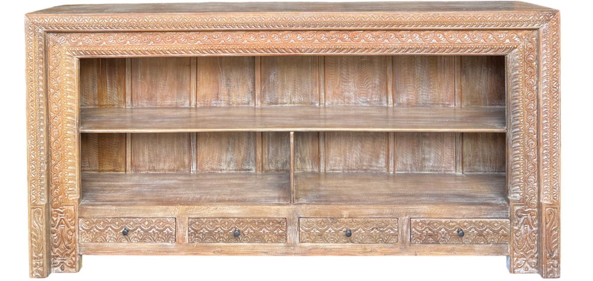 Crafted from premium teak wood sourced from India, this striking console table showcases exceptional hand-carved detailing that elevates any entryway or living space. The thoughtfully designed layout features a central partition that organises display items while maintaining visual balance, complemented by a practical drawer at the base for discreet storage. The warm, rich grain of teak develops a beautiful patina over time, ensuring this piece becomes more distinguished with age. A refined statement piece that seamlessly blends functionality with artisanal craftsmanship.
