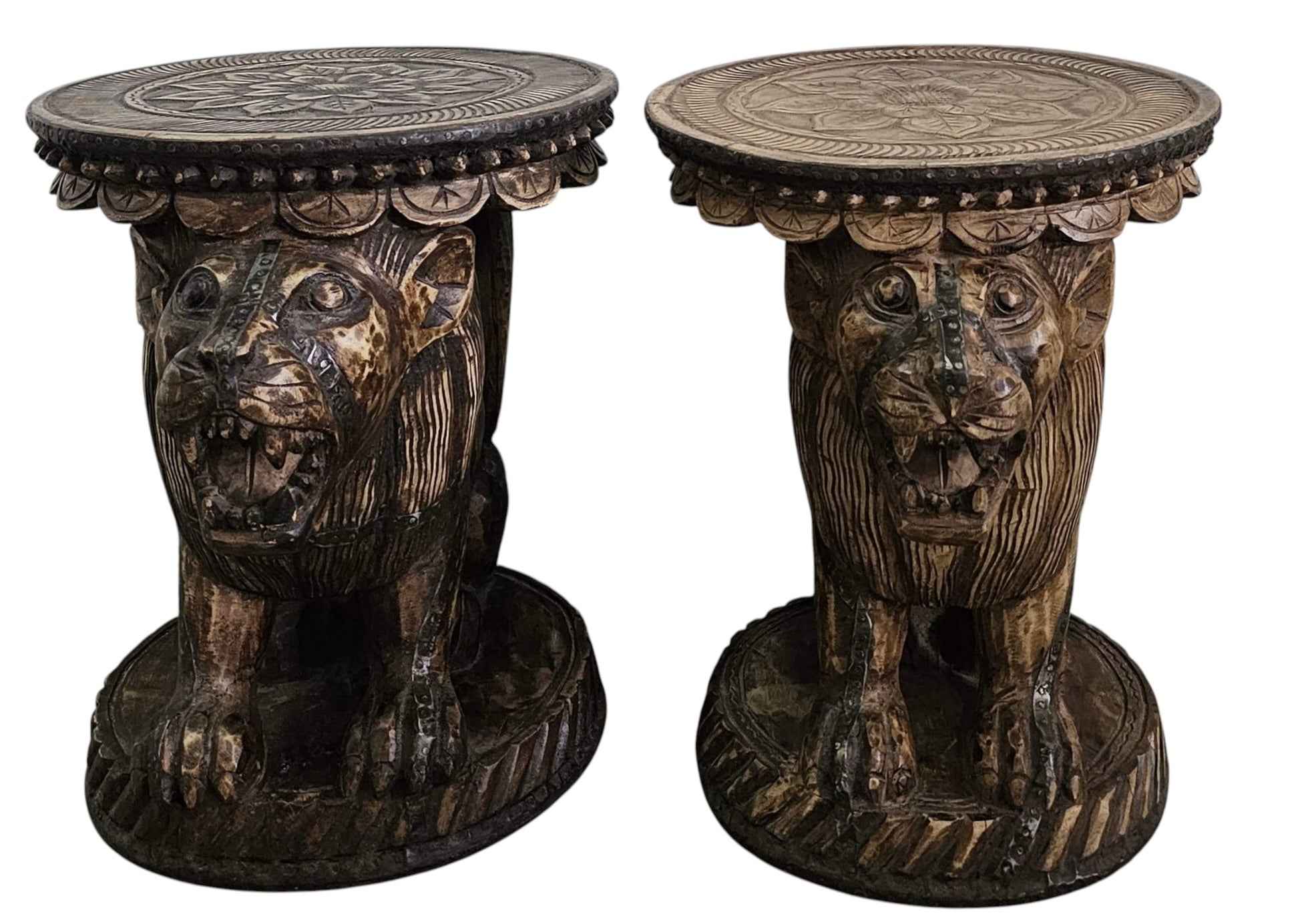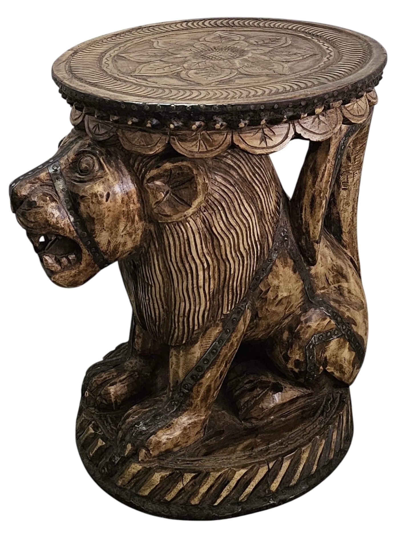 This Nagaland vintage side table, over 180 years old, features a distinctive lion-faced design that reflects rich cultural heritage and artisanal craftsmanship. Its timeless elegance and historical significance make it a unique statement piece, ideal for adding character and sophistication to any living space. Durable and intricately detailed, it offers both functional use and a glimpse into traditional artistry.