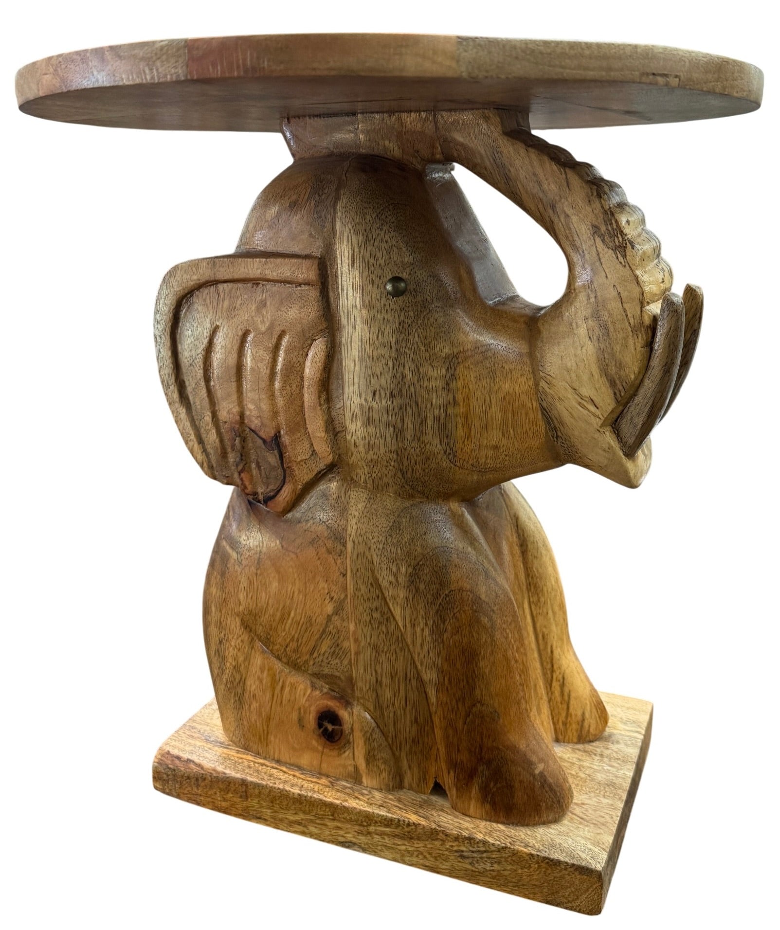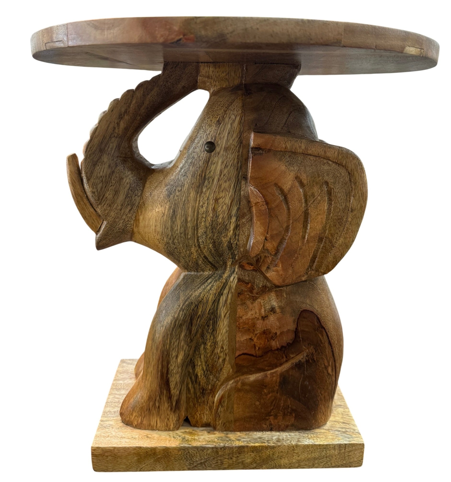 Handcrafted in India, this distinctive side table marries artisanal tradition with contemporary design. The sculptural elephant base provides striking visual interest, while the round timber top showcases natural grain and warmth. Constructed from quality materials with meticulous attention to detail, each piece reflects the skill of master craftspeople. Perfect for adding character to living spaces, this functional accent table serves as both practical surface and conversation-starting art object.