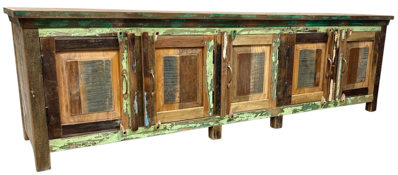 Crafted from reclaimed wood, this 5-door TV unit blends sustainable design with timeless sophistication. Its spacious compartments offer ample storage for media essentials, while the natural wood finish adds warmth and character to any living space. Ideal for those seeking elegant functionality with an eco-conscious touch.