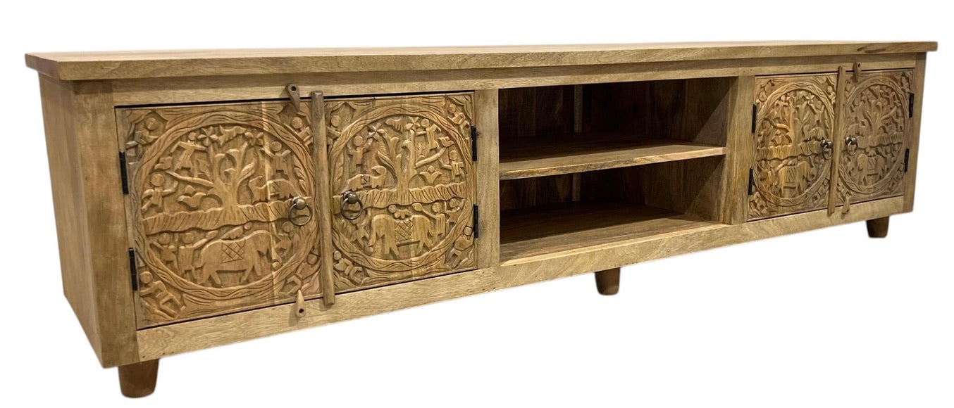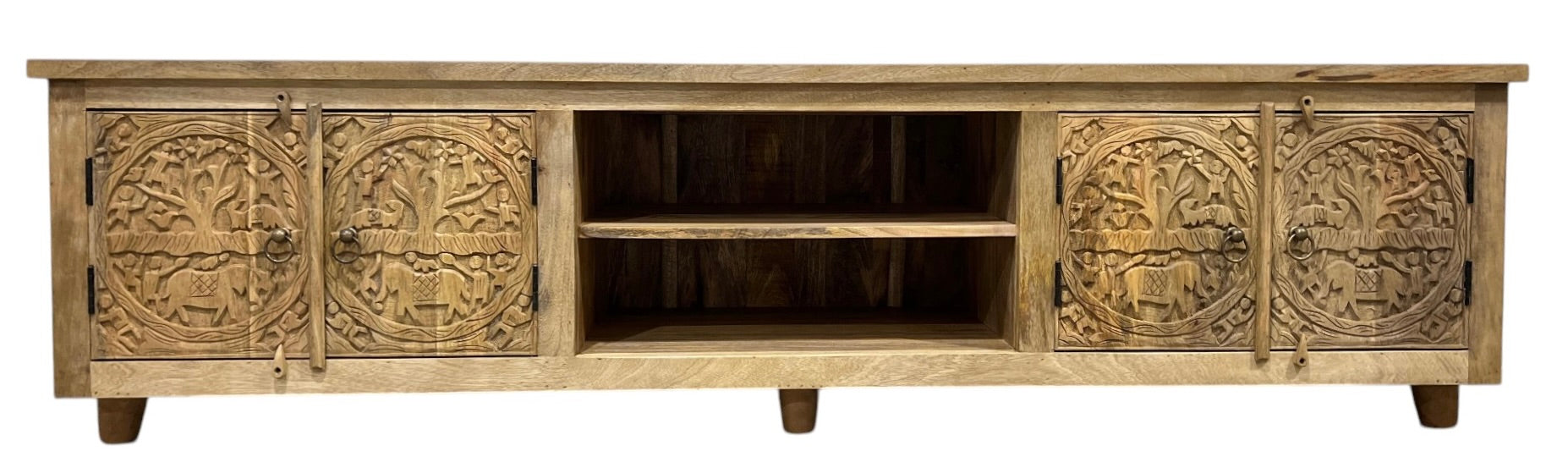 Experience timeless elegance with this large carved entertainment unit, hand-crafted in India. Its intricate detailing and sturdy construction offer both functionality and refined style, providing a sophisticated centerpiece for your living space. Perfect for organizing your media essentials while adding an artisan touch that elevates your home décor.