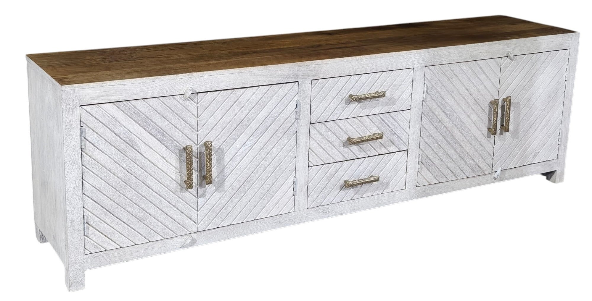 This handcrafted entertainment unit combines modern design with timeless elegance. Featuring white doors and a spacious drawer, it offers ample storage while maintaining a sleek appearance. The natural wood top adds warmth and contrast, creating a sophisticated centerpiece for any living space. Perfect for organizing media devices and keeping your room clutter-free with style.