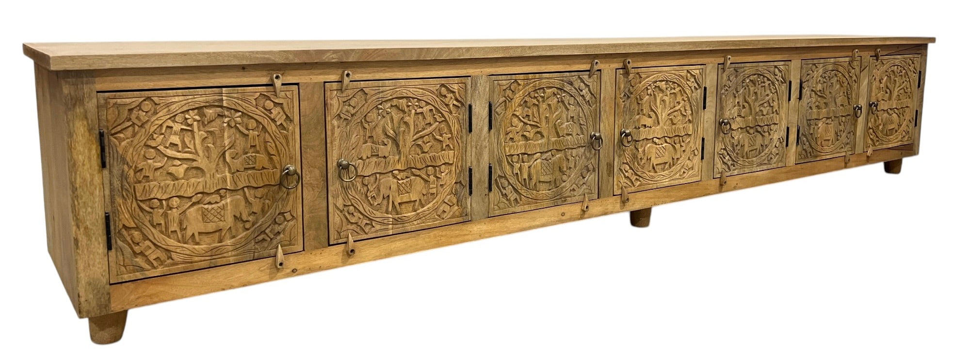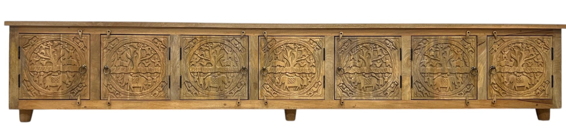 This impressive large TV unit features seven intricately carved mango wood doors, showcasing exceptional craftsmanship from India. Its generous storage space combines practicality with refined elegance, ideal for organizing your media essentials while enhancing your living room with timeless style. The natural wood finish adds warmth, making it a sophisticated centerpiece for any home.